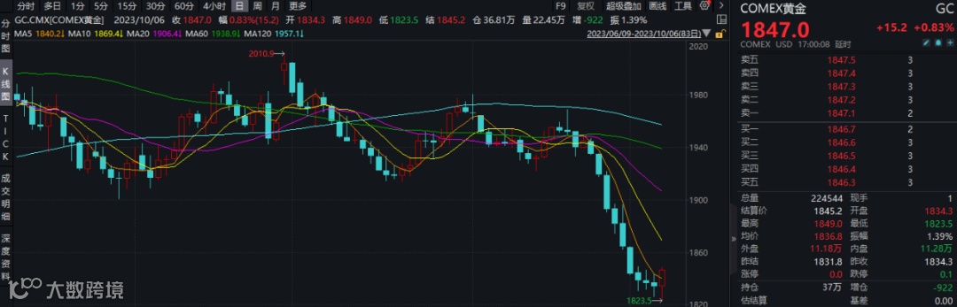从纽约商品交易所黄金期货走势图上可以看到,当地时间9月25日至10月5日,纽约黄金出现了罕见的“九连阴”。分析人士认为,美债收益率走高和美元走强是金价走弱的主要原因。