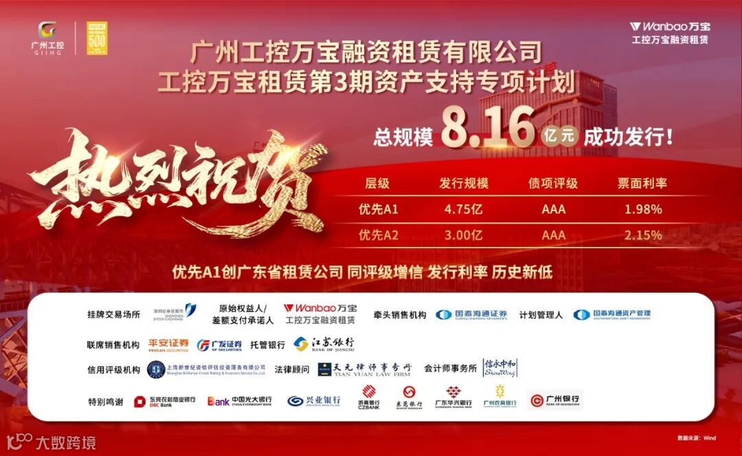 2025年11月4日,广州工控万宝融资租赁有限公司(以下简称工控万宝融资租赁)20亿元储架ABS项下“工控万宝租赁第3期资产支持专项计划”在深交所债券市场成功发行。