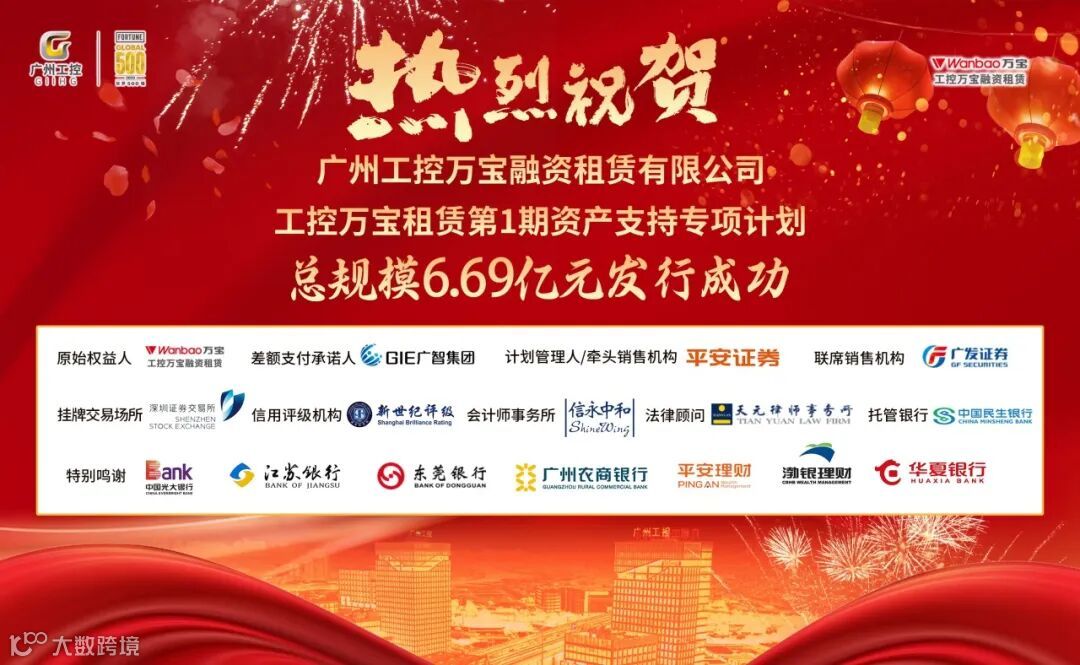 本期ABS由广州智能装备产业集团担任差额支付承诺人,平安证券担任计划管理人及牵头销售机构,广发证券担任联席销售机构。工控万宝融资租赁自2021年9月发行首单交易所ABS以来,在资本市场上持续发力,已在深交所连续发行了6期融资租赁ABS项目,共计融资30余亿元,受到广大投资人的关注和认可,充分彰显了资本市场对广州工控和工控万宝融资租赁的经营业绩、管理能力和发展前景的认可与信心。