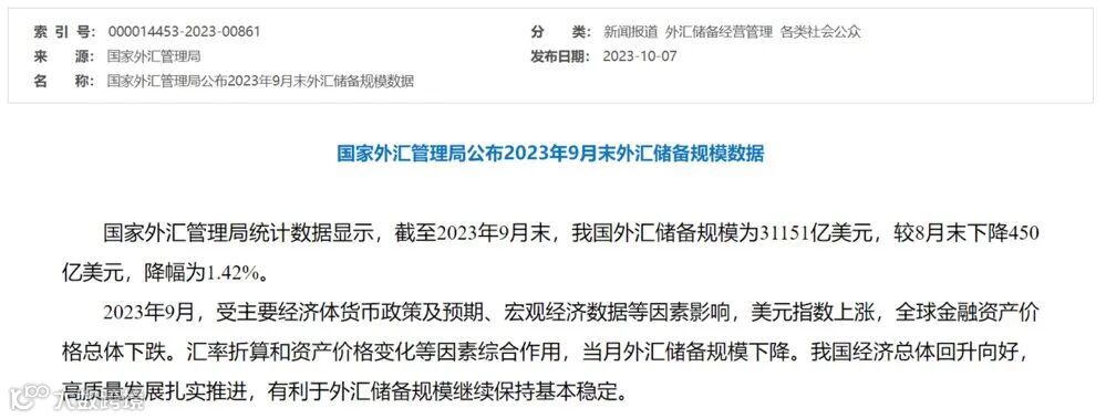 外汇局称,2023年9月,受主要经济体货币政策及预期、宏观经济数据等因素影响,美元指数上涨,全球金融资产价格总体下跌。汇率折算和资产价格变化等因素综合作用,当月外汇储备规模下降。我国经济总体回升向好,高质量发展扎实推进,有利于外汇储备规模继续保持基本稳定。