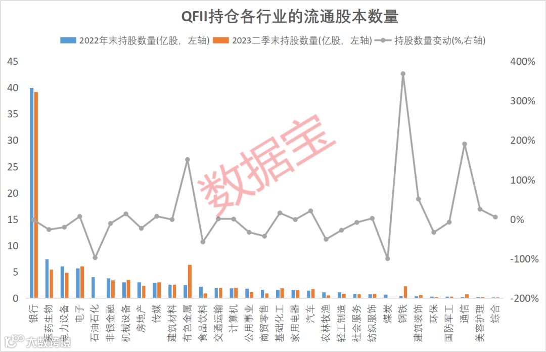与此同时,2023年二季末QFII持有的食品饮料、医药生物、房地产行业股票数量较2022年末下降超20%;非银金融行业下降超10%,银行板块下降近2%。其中,大金融、家用电器板块遭QFII持续减仓。
