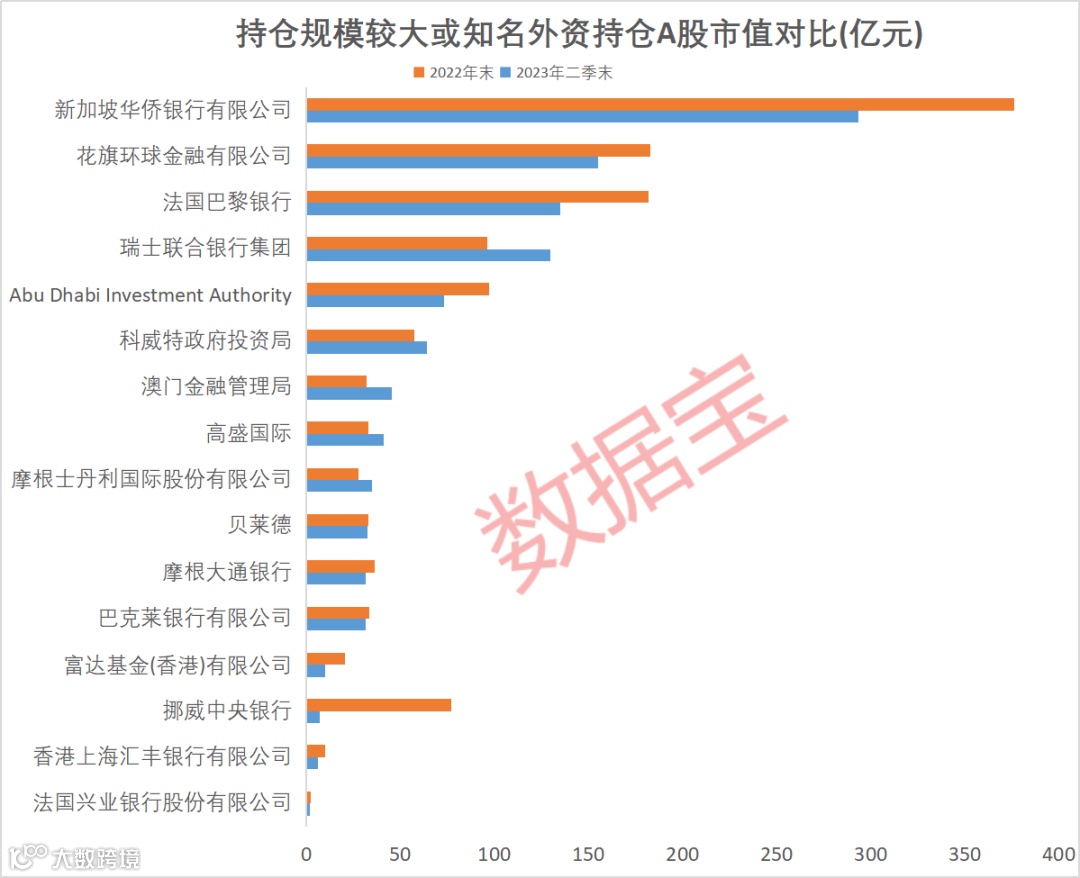 在众多外资机构当中,资产规模较大或知名度较高的资管机构的持仓最受投资者关注。证券时报·数据宝以持仓规模较大或知名度较高的16家外资机构来看,瑞士联合银行、科威特政府投资局、高盛国际等5家QFII机构2023年二季末的持仓市值较2022年末增加。新加坡华侨银行、花旗环球金融有限公司及法国巴黎银行持仓市值稳居前三,且持续超过百亿,其中花旗环球金融有限公司持仓市值较去年同期大幅增加。