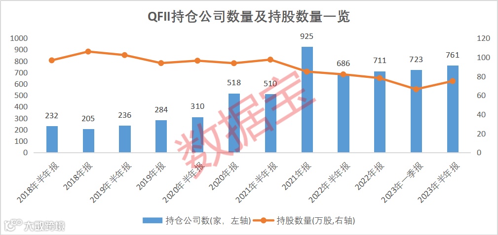 根据2023年半年报披露数据,QFII持有761家A股公司合计96.67亿股的流通股本,持股数量较2022年末有所下降,但超去年同期水平;持股公司家数较2022年末增加50家;持股比例中位数0.91%,较2022年末略升。