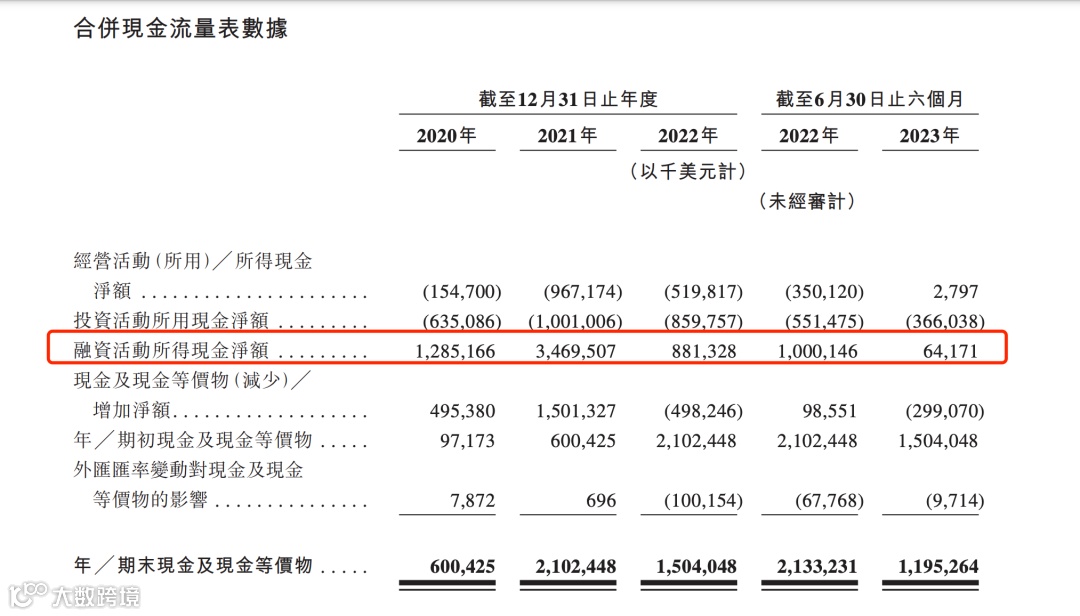 由于其经营收入并不能覆盖经营成本,所以一直以来,极兔都极端依赖外部融资。据招股书显示,自2021年开始,极兔的融资活动所得现金净额愈发减少。