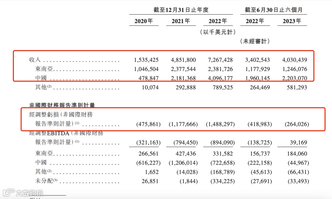 其中,2020年至2021年,东南亚业务为公司第一大收入贡献者,分别为10.47亿美元、23.77亿美元,而2022年以来,中国业务反超东南亚业务,成为收入最大贡献者,中国业务收入分别达到40.96亿美元、22.03亿美元,占总营业收入比重为56%、55%。