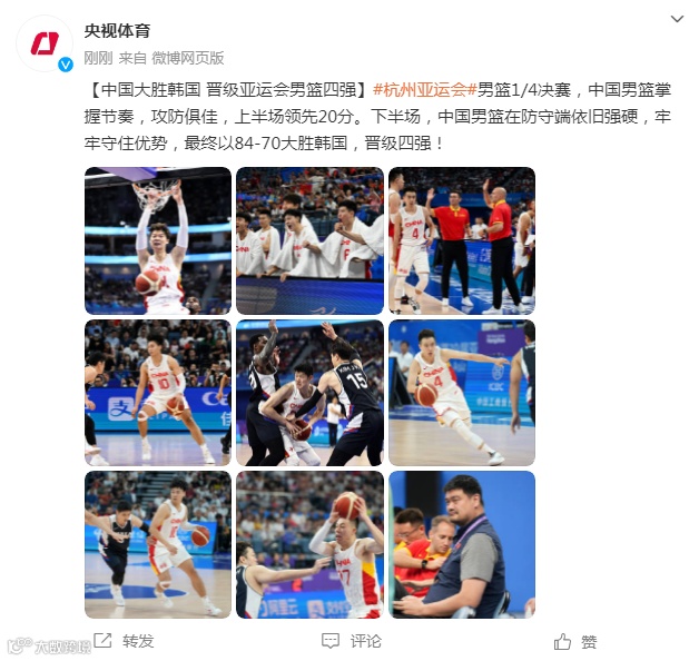 杭州亚运会男篮1/4决赛,中国男篮掌握节奏,攻防俱佳,上半场领先20分。下半场,中国男篮在防守端依旧强硬,牢牢守住优势,最终以84-70大胜韩国,晋级四强!