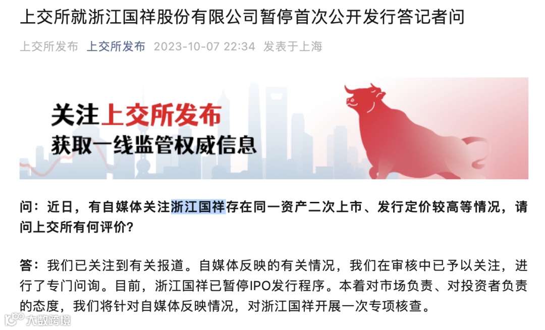 随后,上交所就浙江国祥股份有限公司暂停首次公开发行答记者问:
