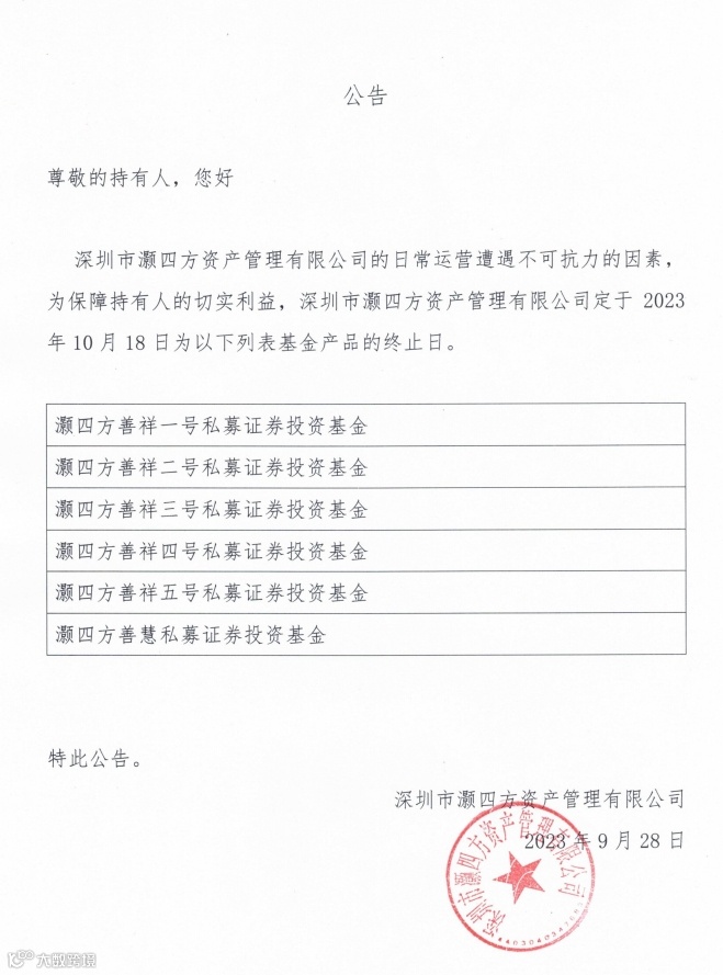 9月28日,善祥基金官网确实公告称,深圳市灏四方资产管理有限公司的日常运营遭遇不可抗力的因素,为保障持有人的切实利益,深圳市灏四方资产管理有限公司定于2023年10月18日为系列基金产品的终止日。这一系列基金产品包括灏四方善祥基金1-5号产品和灏四方善慧产品。