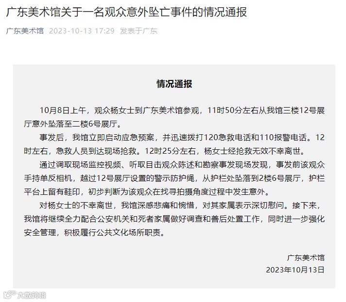 10月13日,广东美术馆发布“广东美术馆关于一名观众意外坠亡事件的情况通报”: