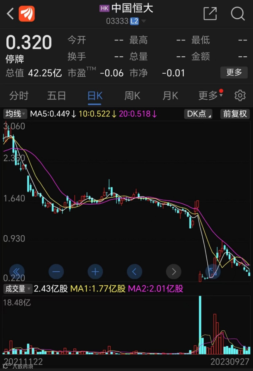 就在9月27日,港股“恒大系”股价尾盘全线跳水,截至当天收盘,中国恒大跌18.99%,报0.32港元/股,总市值42.25亿港元。恒大汽车跌20%,报0.56港元/股,总市值60.73亿港元。恒大物业跌14.49%,报0.59港元/股,总市值报63.78亿港元。