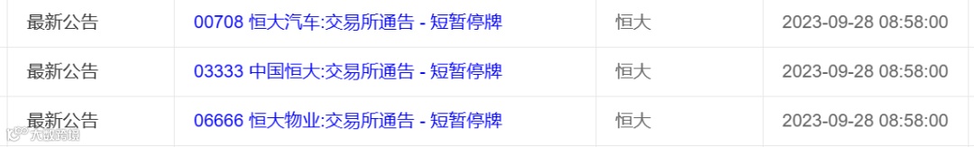 9月28日早间,港交所通告,中国恒大、恒大物业和恒大汽车纷纷披露公告,于今天上午九时正起短暂停止买卖。