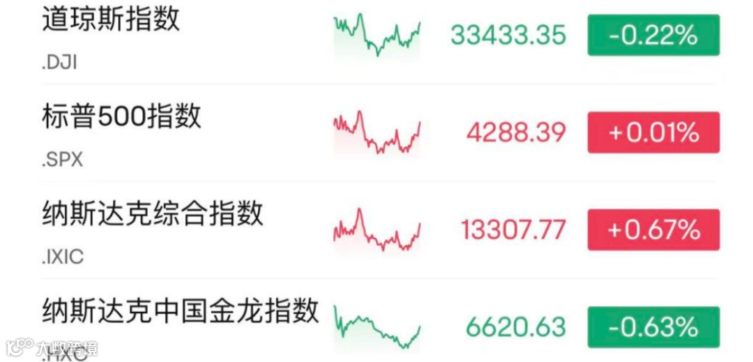 当地时间10月2日,美股三大股指涨跌不一,截至收盘,道指跌0.22%,报33433.35点;标普500指数微涨0.01%,报4288.39点;纳指涨0.67%,报13307.77点。