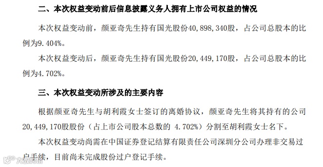 根据颜亚奇与胡利霞签订的离婚协议,颜亚奇拟将其持有的公司2045万股股份,约占公司总股份的 4.702%,分割至胡利霞名下。本次权益变动后,颜亚奇持有公司2045股股份,约占公司总股本4.702%,不再是公司持股5%以上股东;胡利霞持有公司2045股股份,约占公司总股本4.702%。由此可见,双方对于国光股份的持股进行了对半分。