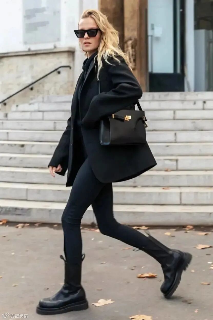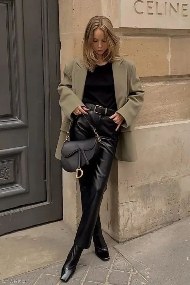 这些年随着复古风回潮,皮质小黑裤在时尚圈又重新流行起来了。与干练的西装搭配,飒爽帅气,生出一种「老娘很不好惹」的强势