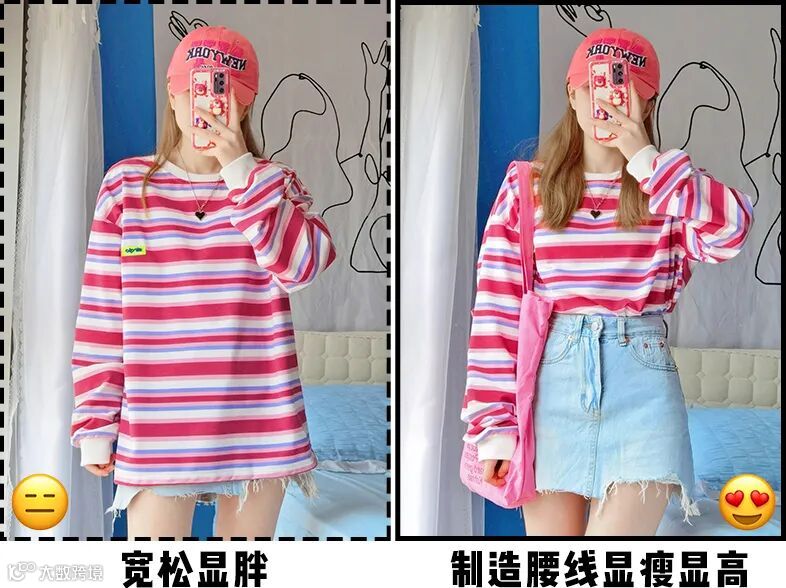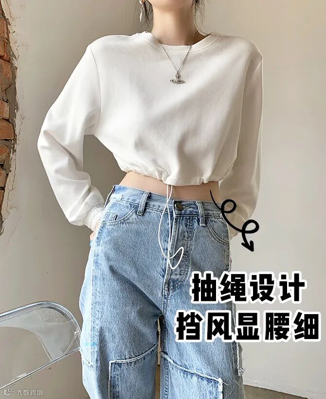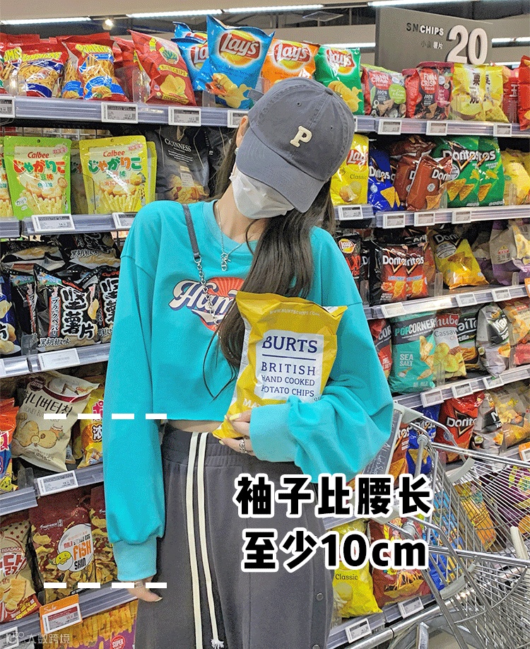 避雷第一步,就是看袖子和腰的长度。袖子比腰长至少10cm,比如crop top,视觉上就会有腕线过档的感觉,显高显瘦两手齐抓。