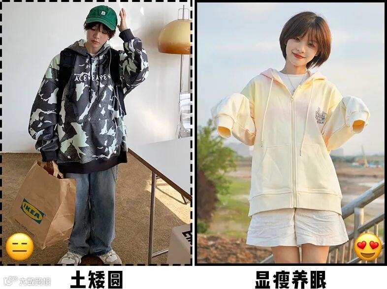 卫衣款式再多,oversized依旧是稳稳的主流,宽宽大大的贼能藏肉,但这种版型对矮个子来说,上身就是五五分+土肥圆既视感