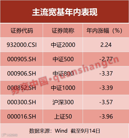 2021年以来,以沪深300和中证500为代表的大中盘指数表现持续弱势,而小盘风格指数则表现强势,以中证2000指数为代表的小微盘指数逐渐受到市场关注。据wind数据统计,截至9月14日,中证2000指数年内涨幅为2.24%,而同期上证50、沪深300、中证1000、中证800、中证500等主流宽基指数均告负。