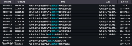 其中涉及金额较大的微光股份,8月以来已先后3次发布逾期兑付风险。9月15日公告显示,公司购买的今年9月11日至9月15日到期的4只中融信托产品逾期未能兑付,合计金额2.3亿元。这些产品的预期年化收益率在5.4%至6.3%之间。