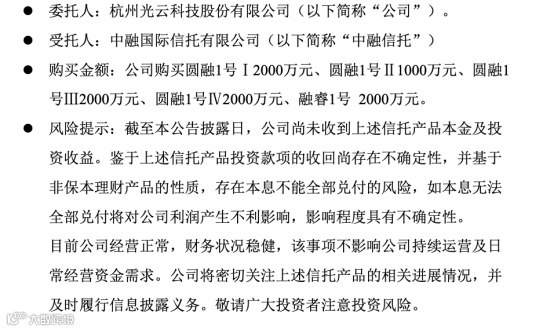 此后,光云科技分别于今年4月26日、5月26日、6月28日、7月7日、7月14日、4月26日购买了中融信托发行的5只信托产品,其中4只产品投资额2000万元,1只产品投资额1000万元,合计9000万元。