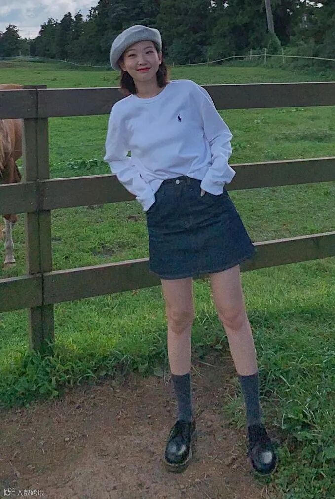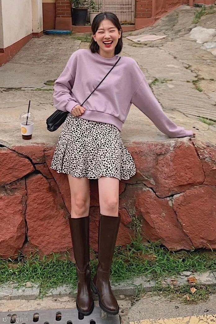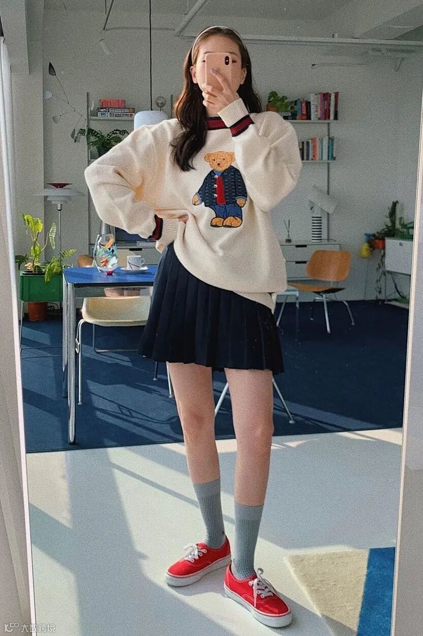 卫衣塞进A型短裙里,元气十足,小个子也能穿出大长腿。