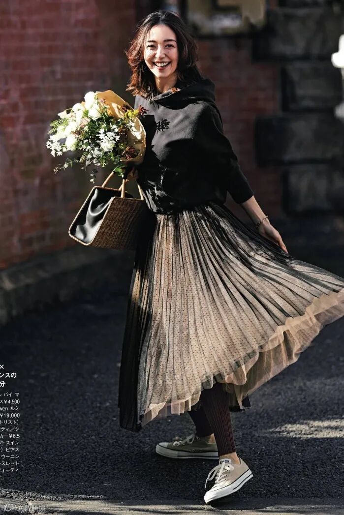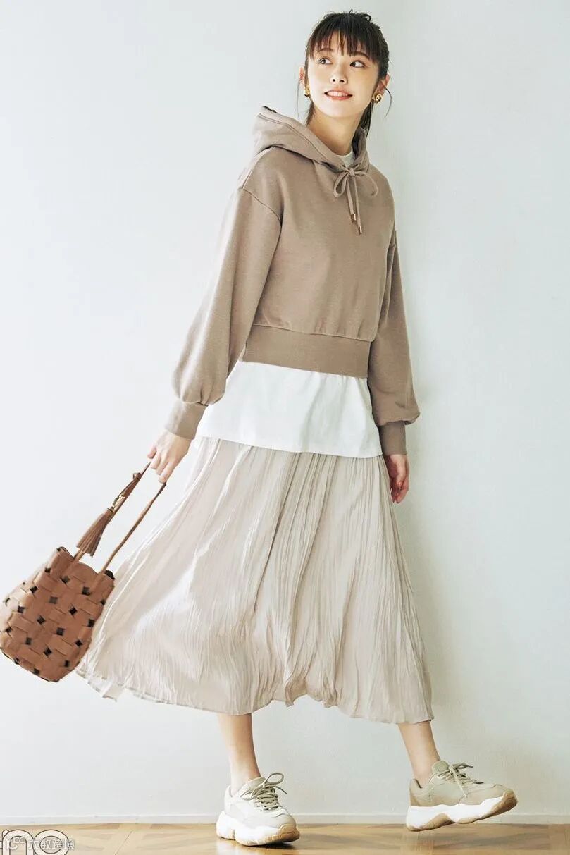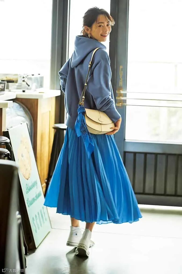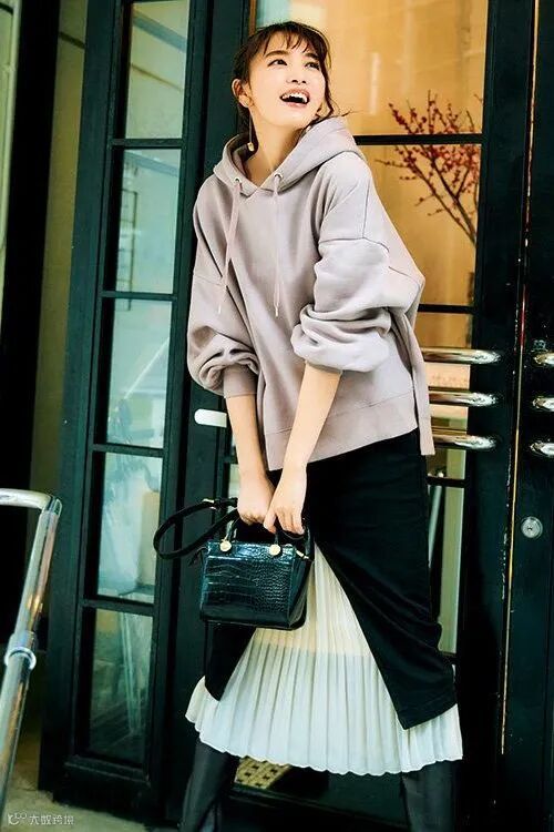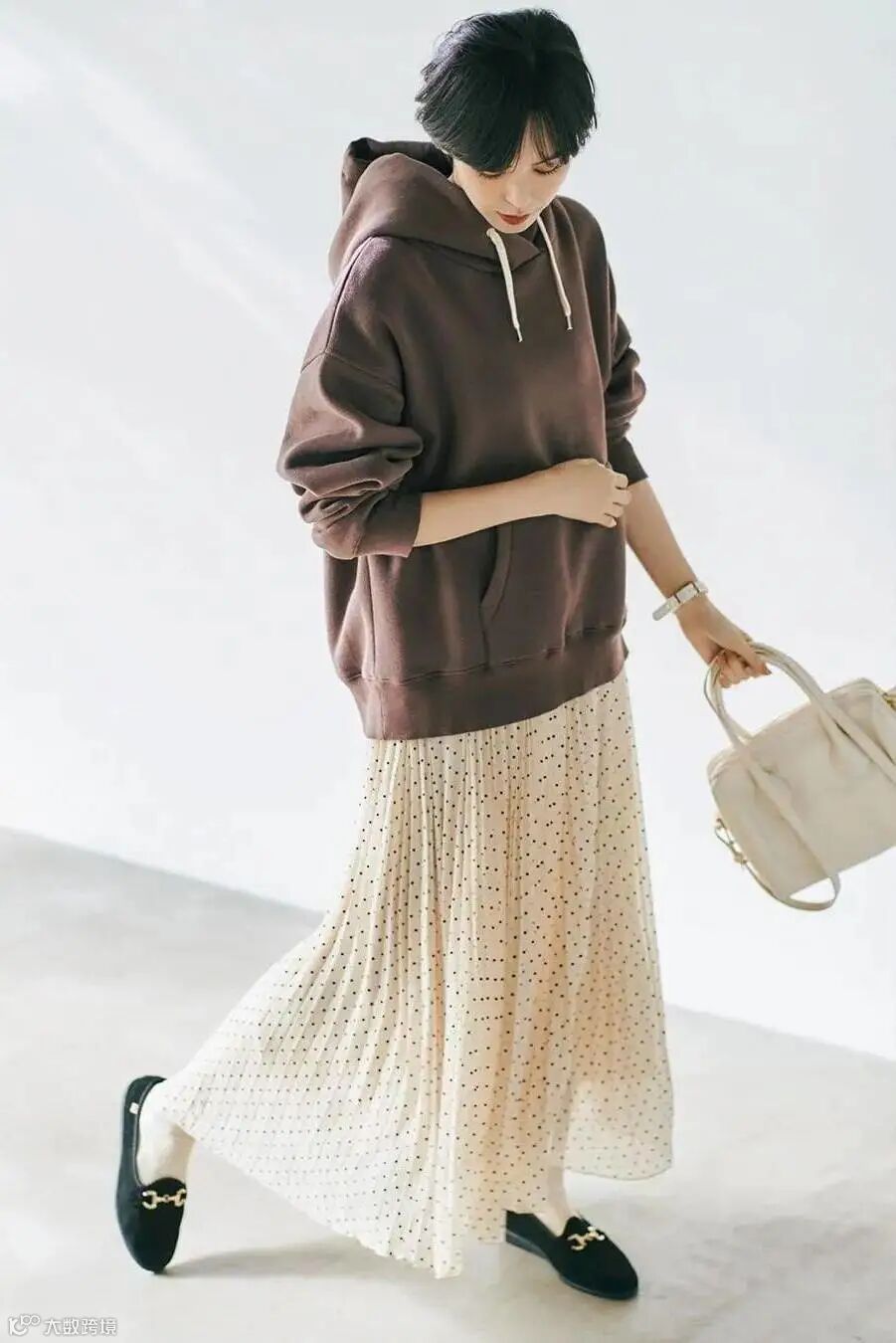 百褶裙一直给人优雅知性的印象,而有了卫衣的加入,则能让你的百褶裙穿搭看起来更具亲和力,也更加元气活力。