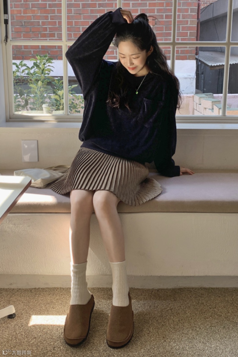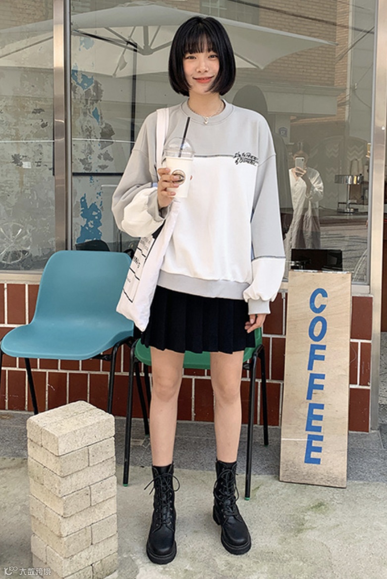 灰色卫衣和A型的黑色及膝百褶皮裙,有着帅气的小俏皮,拉长下半身比例也增添女人味,还让配色变得更加亮眼起来。