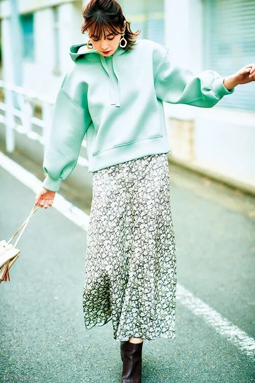 中性风格的卫衣可以完美中和淡化掉印花图案惯有的甜腻感,令你的整体造型更加大气耐看,而养眼绚丽的印花裙的加入,也能够让你的卫衣look美貌升级时髦翻倍。