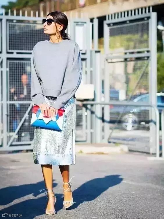 素灰色的卫衣搭配blingbling材质让的铅笔裙,让你不张扬的抢眼着~