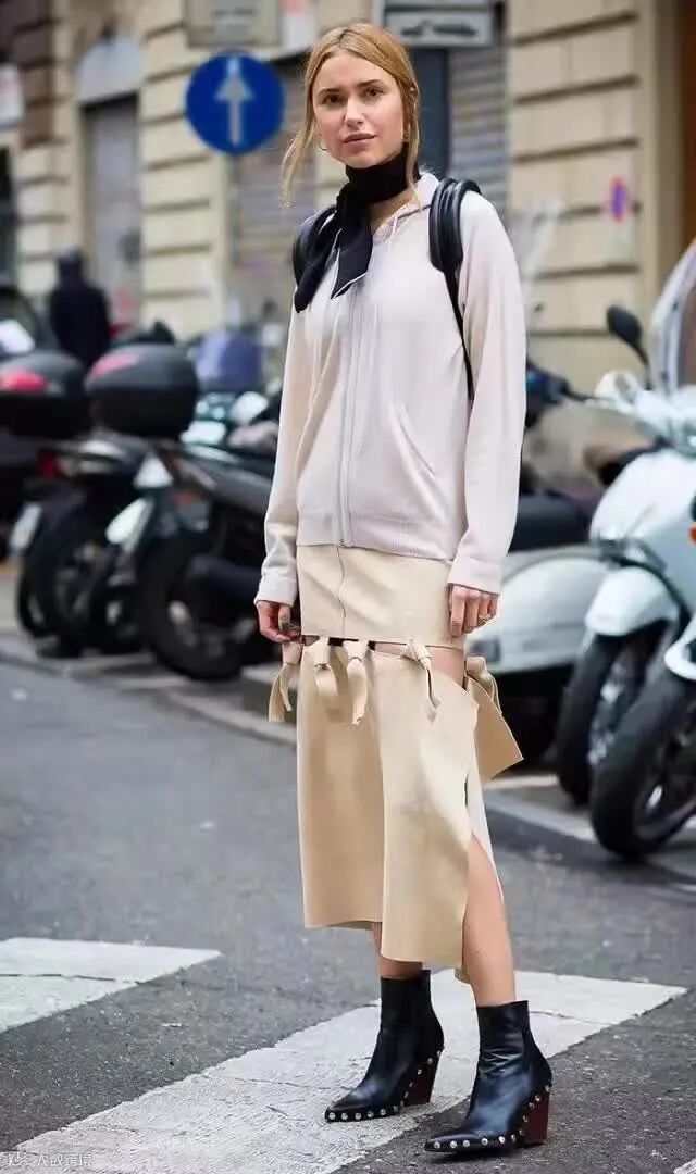 特别是像这样用中性风格的运动鞋、短靴来混搭你的卫衣+百褶裙look,无疑街头气息会更加浓厚,甜酷十足。