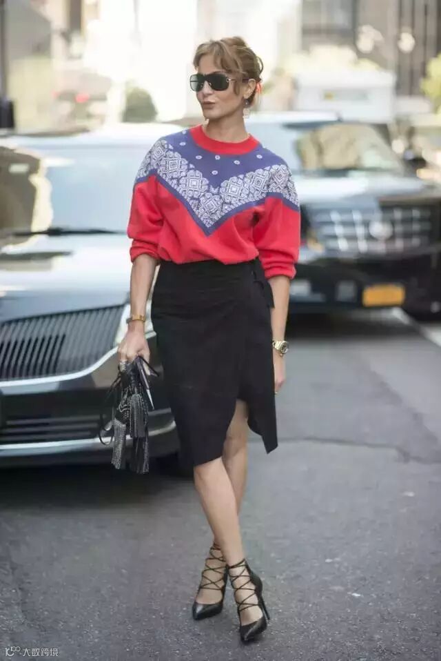 拼色印花卫衣塞入黑色及膝铅笔裙,搭配一双高跟鞋,元气也很有女人味,裙子的小开叉设计是个显高小心机。