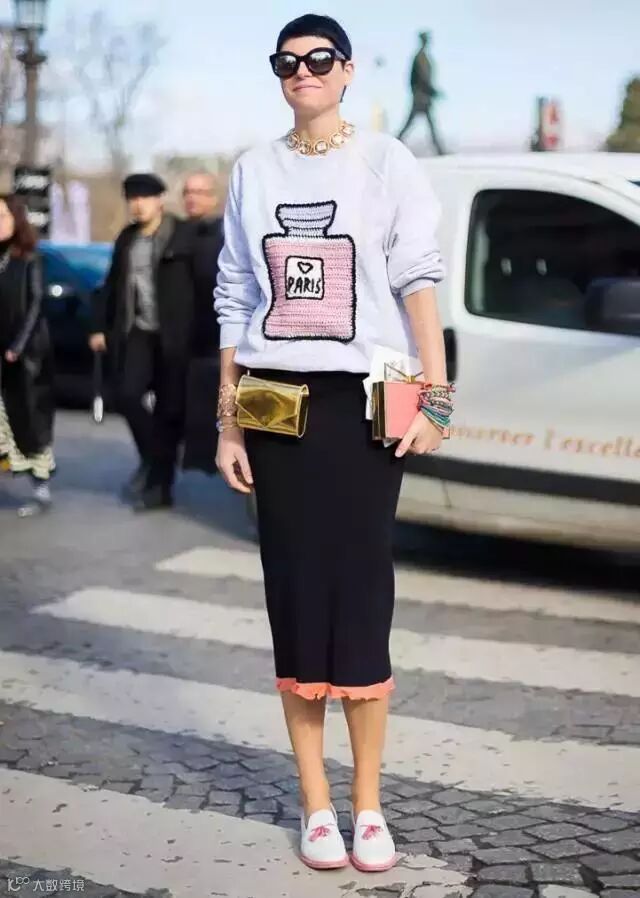 印有图案的卫衣看起来更可爱一些,搭配简单的黑色铅笔裙,经典黑白配穿出简单大方感。