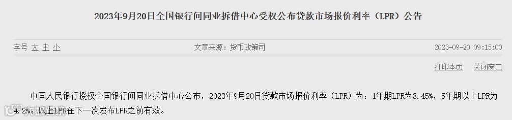 9月20日,人民银行授权全国银行间同业拆借中心公布了新一期贷款市场报价利率(LPR)。其中,1年期LPR为3.45%,上月为3.45%;5年期以上LPR为4.2%,上月为4.2%。本月LPR报价维持不变。