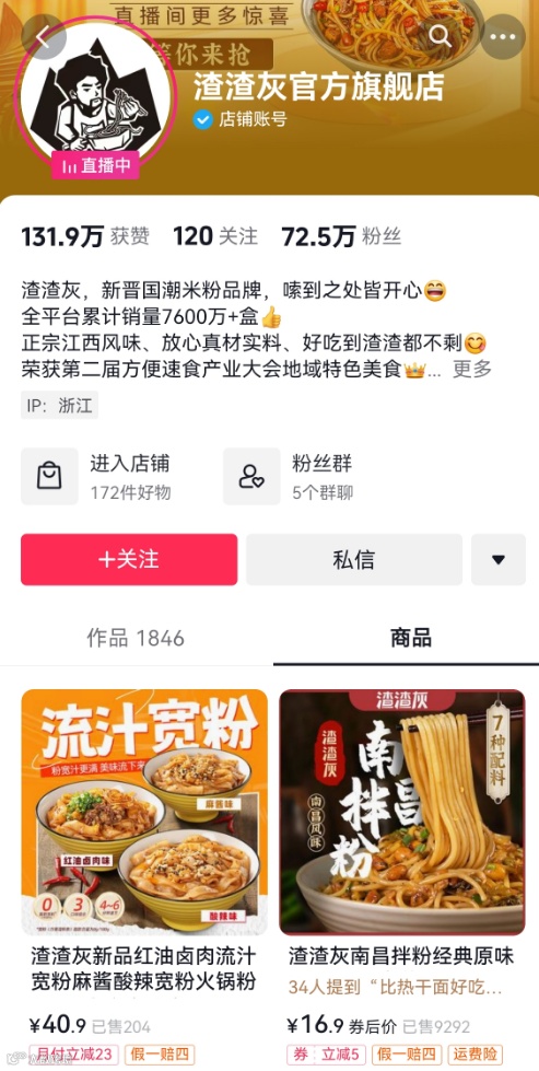 官方信息显示,其速食米粉全平台累计销量超过7600万盒,按照总商品交易额计算,“渣渣灰”为速食行业中增长最快的品牌之一。