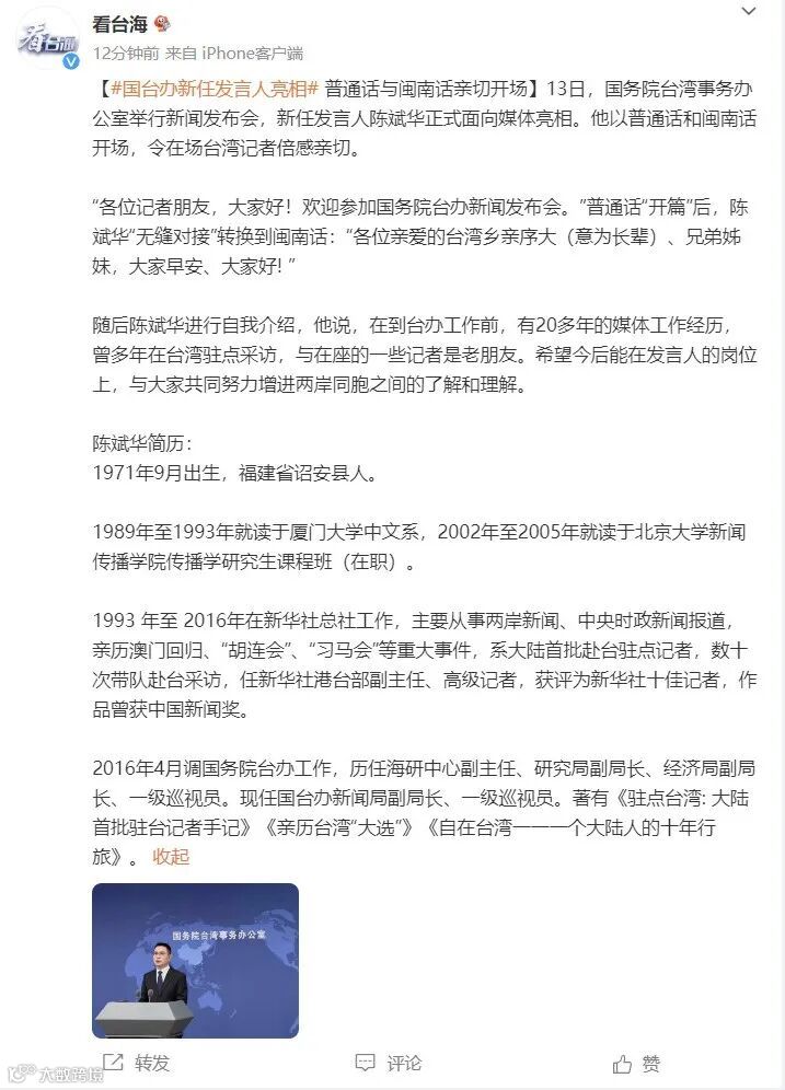 国台办新任发言人陈斌华首亮相,用闽南语带来问候。