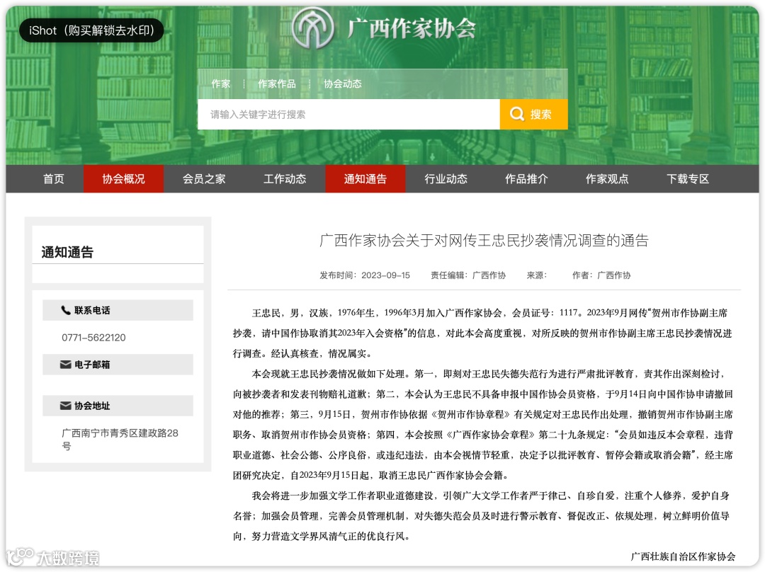 近日,关于广西贺州市作协副主席王忠民涉嫌抄袭一事在网络上热传。9月15日,广西作家协会通报,王忠民抄袭情况属实,撤销其贺州市作协副主席职务,取消其广西作协会籍。