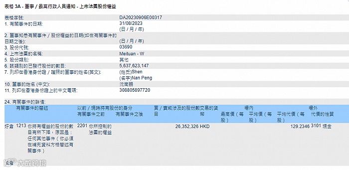 港交所权益披露资料显示,红杉中国减持美团股票,持股比例由2.32%降至1.86%,交易均价129港币,共减持2635万股,涉资约34亿港元。