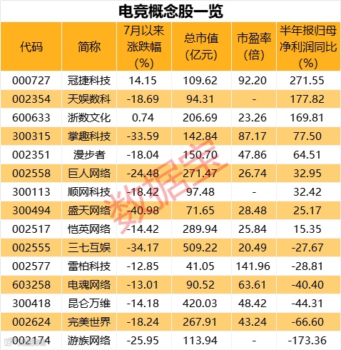 证券时报·数据宝统计,A股中电竞概念股除相关游戏个股外,还包括电竞设备、电竞酒店、电竞赛事相关的个股。业绩上来看,15只电竞概念股中,9只上半年业绩实现增长,其中冠捷科技、天娱数科、浙数文化上半年归母净利润同比增幅居前,均在100%以上。