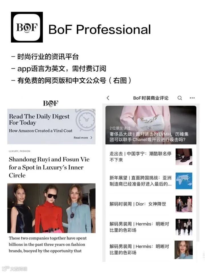 【时尚行业的资讯与时评】BoF是Business of Fasion(时装商业评论)的缩写,是我身边从事时尚行业的朋友们一定会关注的资讯平台,以奢侈品产业为主,也有不少快时尚和美妆。App内为英文,不过他们也有中文内容的公众号。