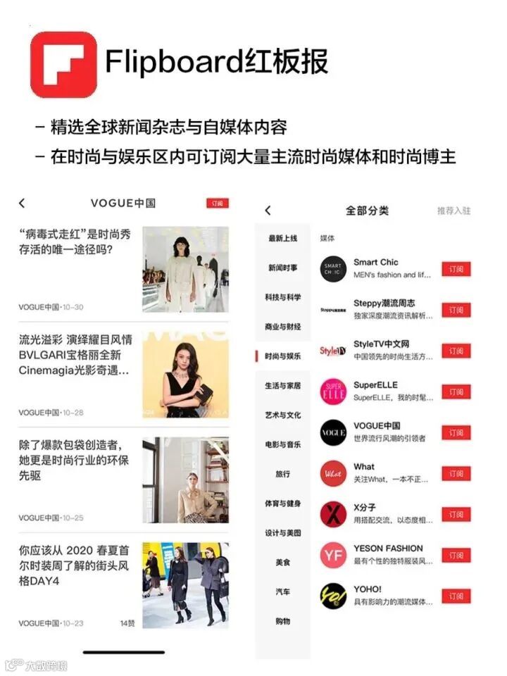 【精心整合主流时尚媒体和优质自媒体】现在有许多整合各平台优质内容的app,但个人比较偏爱红板报。它的时尚区里不仅有大家耳熟能详的主流时尚媒体,比如ELLE,VOGUE和嘉人等等,还有很多小众新潮的独立杂志和博主。