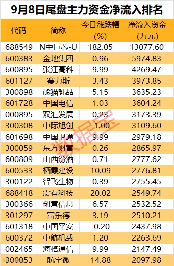 个股方面,近日上市新股N中巨芯-U尾盘资金流入1.31亿元,居首位。该公司专注于集成电路、显示面板等半导体行业所需的电子化学材料的研发、生产和销售,上市首日股价大涨182.1%。