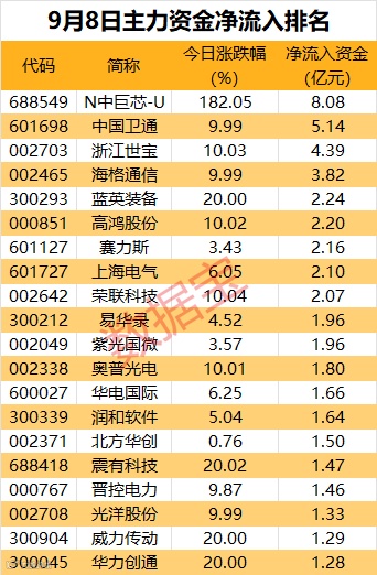 卫星导航概念股中,中国卫通主力资金流入超5亿元,海格通信净流入近4亿元,易华录净流入近2亿元,华力创通净流入超亿元。