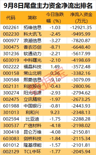 拓维信息是尾盘唯一主力资金净流出超亿元的个股,达到1.29亿元。科大讯飞、浪潮信息、香农芯创尾盘净流出均超5000万元,这些个股都是AI相关的概念股。