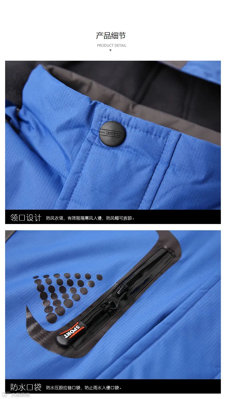 内襟拉链使用YKK拉链,可与外件套穿,袖口及后领均设计可套穿袢。下摆有收缩卡扣,可以调节松紧和大小。