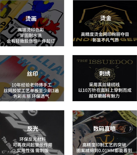 不同的制作工艺对定制图案的要求略有不同,比如丝网印刷适用于定制颜色相对较少的图案,不容易掉图,颜色较多的图案就不太适合;数码直喷更适合深色衣服;想要刺绣就不建议选择弹性过大的面料。