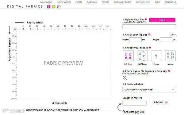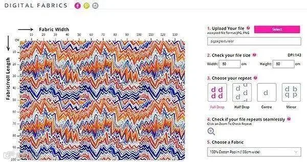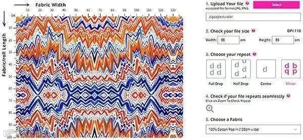在布料预览窗口的右侧,您将看到一个选项列表,包括需要对图稿尺寸进行任何更改以及设计所需的“重复”类型。首次上传作品时,始终会使用“完整删除”重复来显示您的作品。选择“镜像重复”选项。当彼此相邻放置时,这将反映出设计图块的边缘,从而使纹理图稿具有无缝的重复图案。
