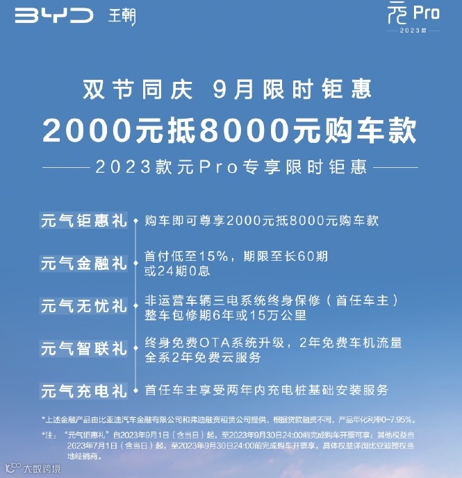 另外,据比亚迪官微消息,2023款元Pro限时购车优惠政策推出,购车即可享2000元抵8000元购车款;非运营车辆三电系统终身保修(首任车主),整车包修期6年或15万公里;终身免费OTA系统升级,2年免费车机流量,全系2年免费云服务;首任车主享受两年内充电桩基础安装服务。