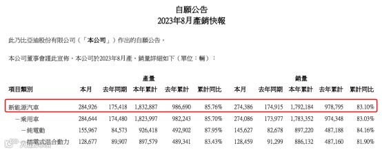 新能源汽车龙头比亚迪9月1日晚公告显示,8月公司新能源汽车销量达274386辆,比去年同期的174915辆大幅增长。今年前8月新能源汽车累计销量约179.22万辆,同比增长83%。
