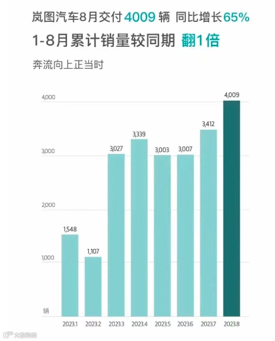 9月1日,东风旗下新能源品牌岚图汽车公布的数据显示,8月岚图交付新车4009辆,同比增长65%,环比增长17%。前8月岚图累计销量同比翻一倍,销量创下历史新高。
