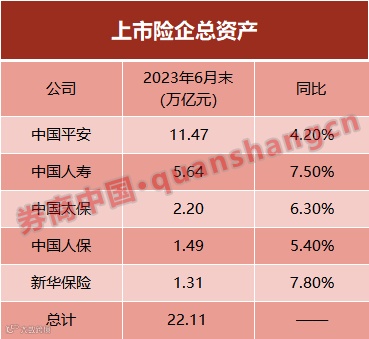 截至2023年上半年末,五大A股上市险企总资产破22万亿元,其中中国平安凭借综合金融优势领先,资产总额达到11.47亿元,中国人寿、中国太保、中国人保、新华保险总资产分别为5.64亿元、2.2亿元、1.49亿元和1.31亿元。