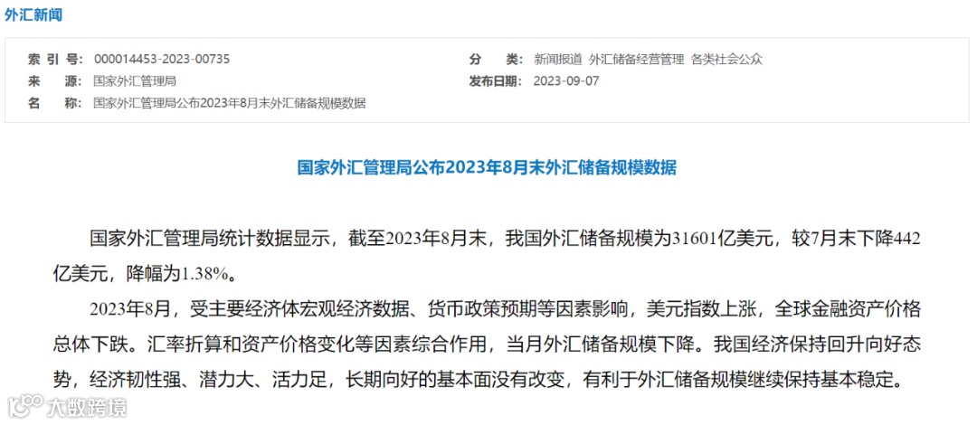 9月7日,国家外汇管理局公布2023年8月末外汇储备规模数据。数据显示,截至2023年8月末,我国外汇储备规模为31601亿美元,较7月末下降442亿美元,降幅为1.38%。